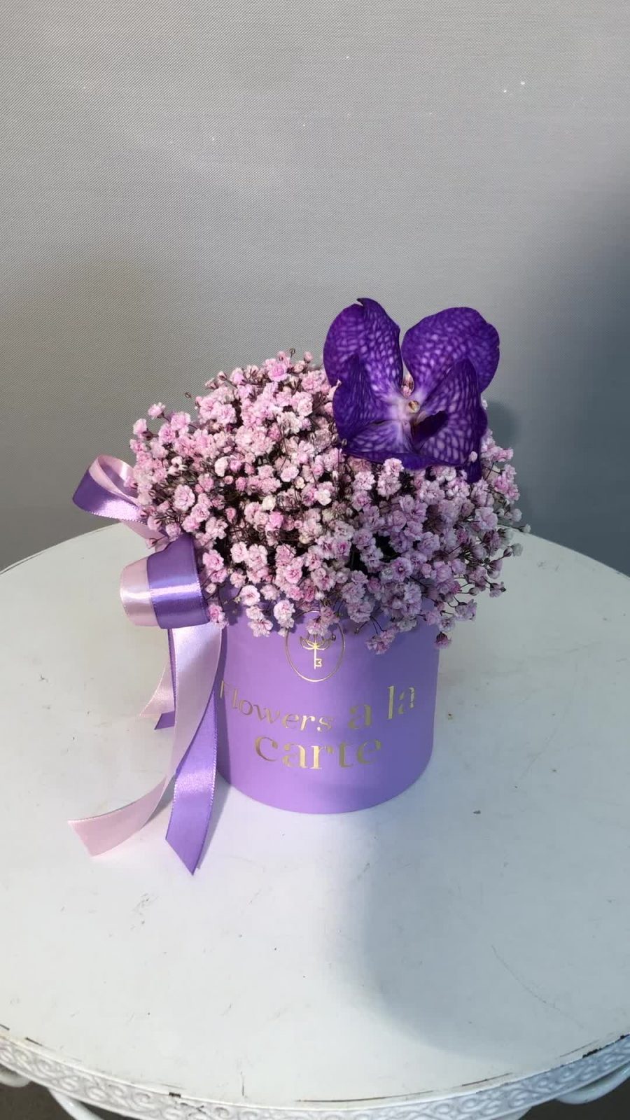 Гипсофила - 4 шт.Орхидея Ванда - 1 шт.Лента атласная - 2 шт.Оазис флористический - 1 шт.коробка шляпная маленькая - 1 шт.